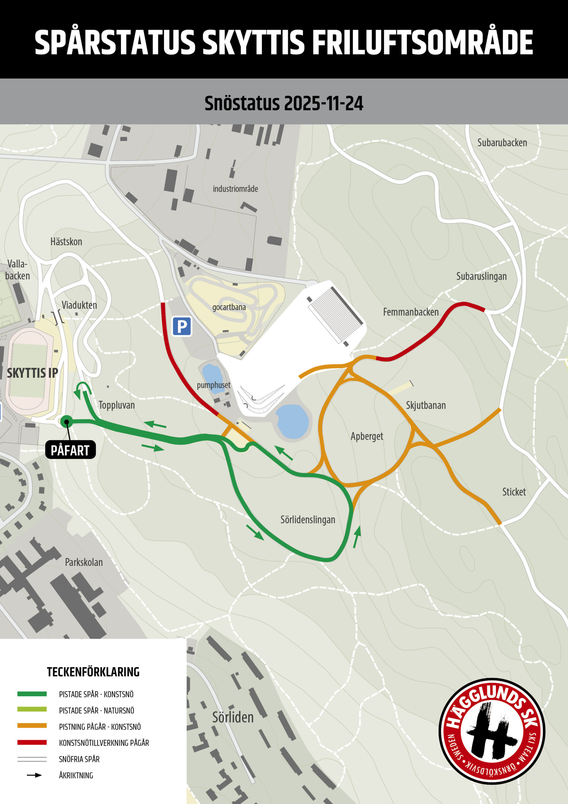 Måndag 2025-11-24 klockan 07:00 öppnar vi spåren för längdskidåkning på Skyttis spårområde för säsongen 2025/26! Vår spårgrupp har arbetat med schaktning av snö under helgen när snötillverkningen varit avstängd och vi kan nu leverera 1,5 km preparerade skidspår!