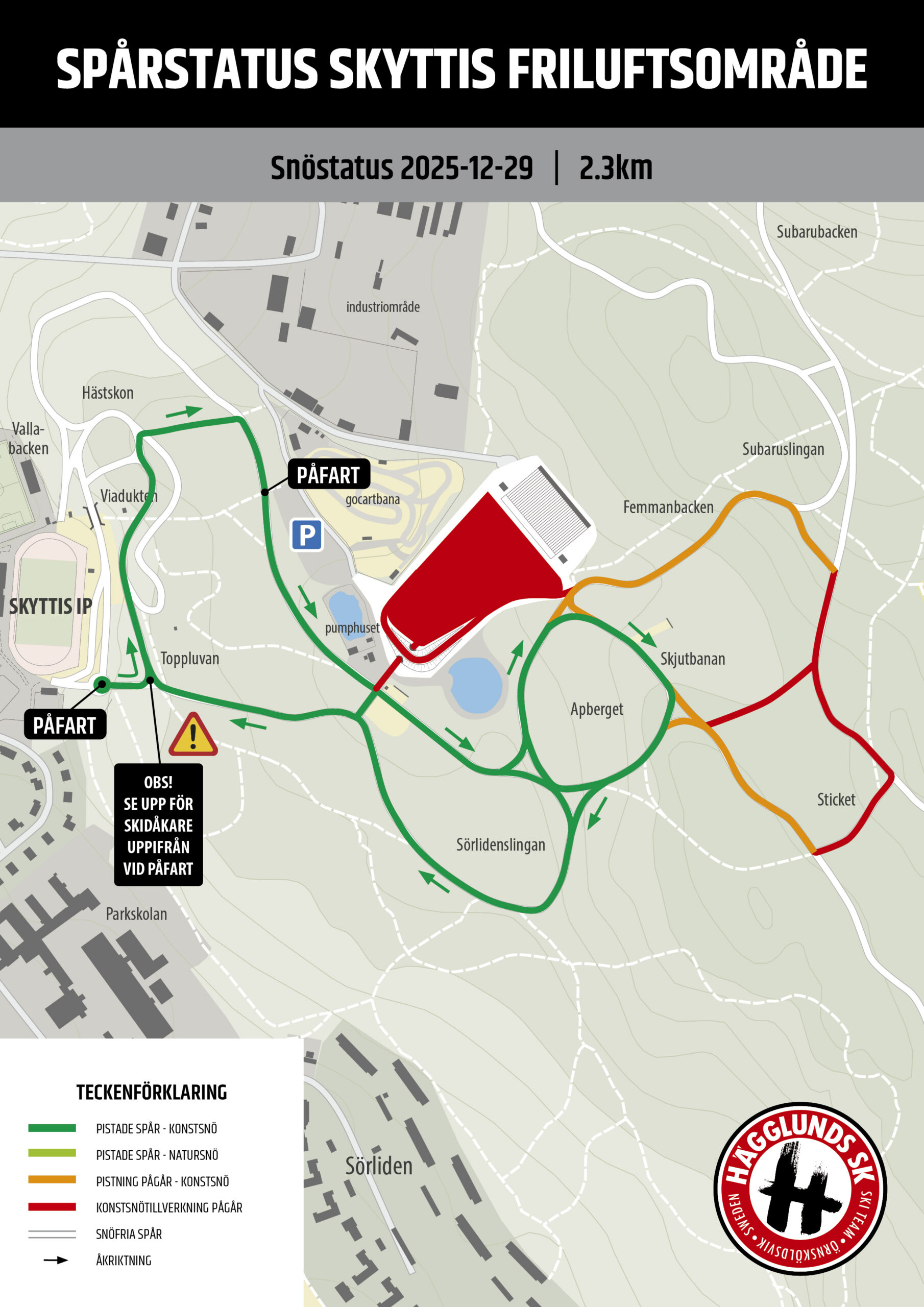 Vi kommer även dra spår upp för “5:an backen”, detta spår vänder dock tillbaks ned för “5:an backen” igen då det inte finns snö runt på övre delen av 5:an ännu. “Nya Stadion” är avstängd på grund av snötillverkning från och med tisdag 2025-12-30 till och med 2025-12-31 och därefter ny omgång från fredag 2026-01-02.